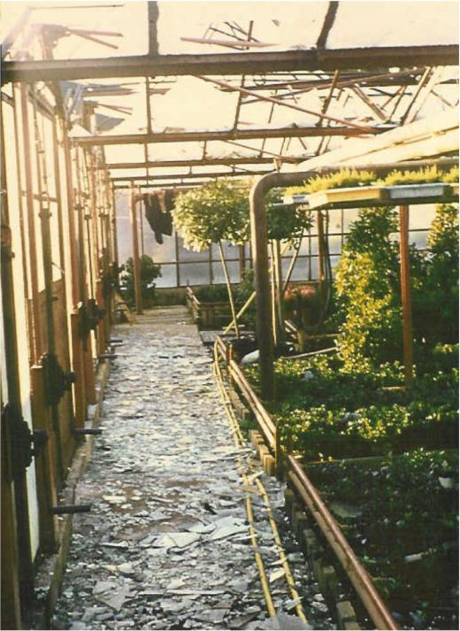 Am 13. November 1972 wird ein großer Teil der Gewächshäuser durch einen Orkan zerstört. 2.500 m² Gewächshausfläche werden vollständig vernichtet und es dauert mehrere Monate bis die Gärtnerei wieder vollends hergestellt ist.